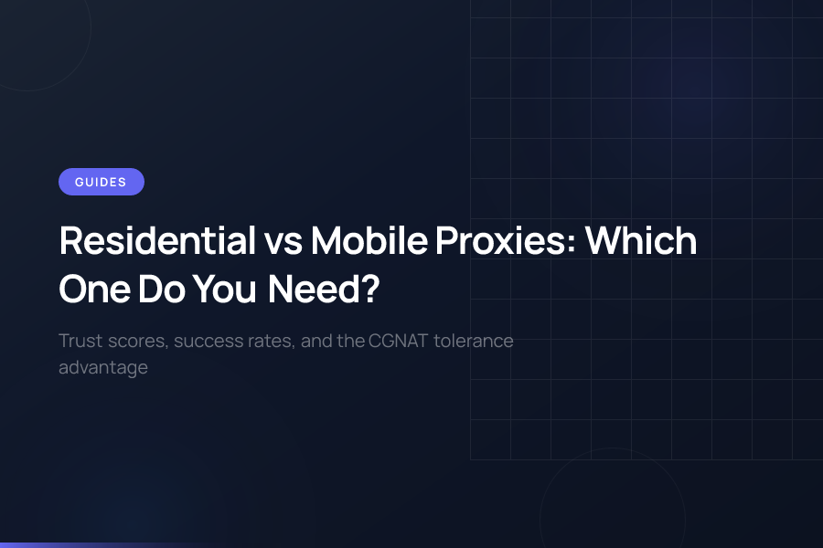 Head-to-head comparison of residential and mobile proxies — trust scores, platform success rates, cost structure, and the CGNAT tolerance advantage that makes mobile IPs unblockable.